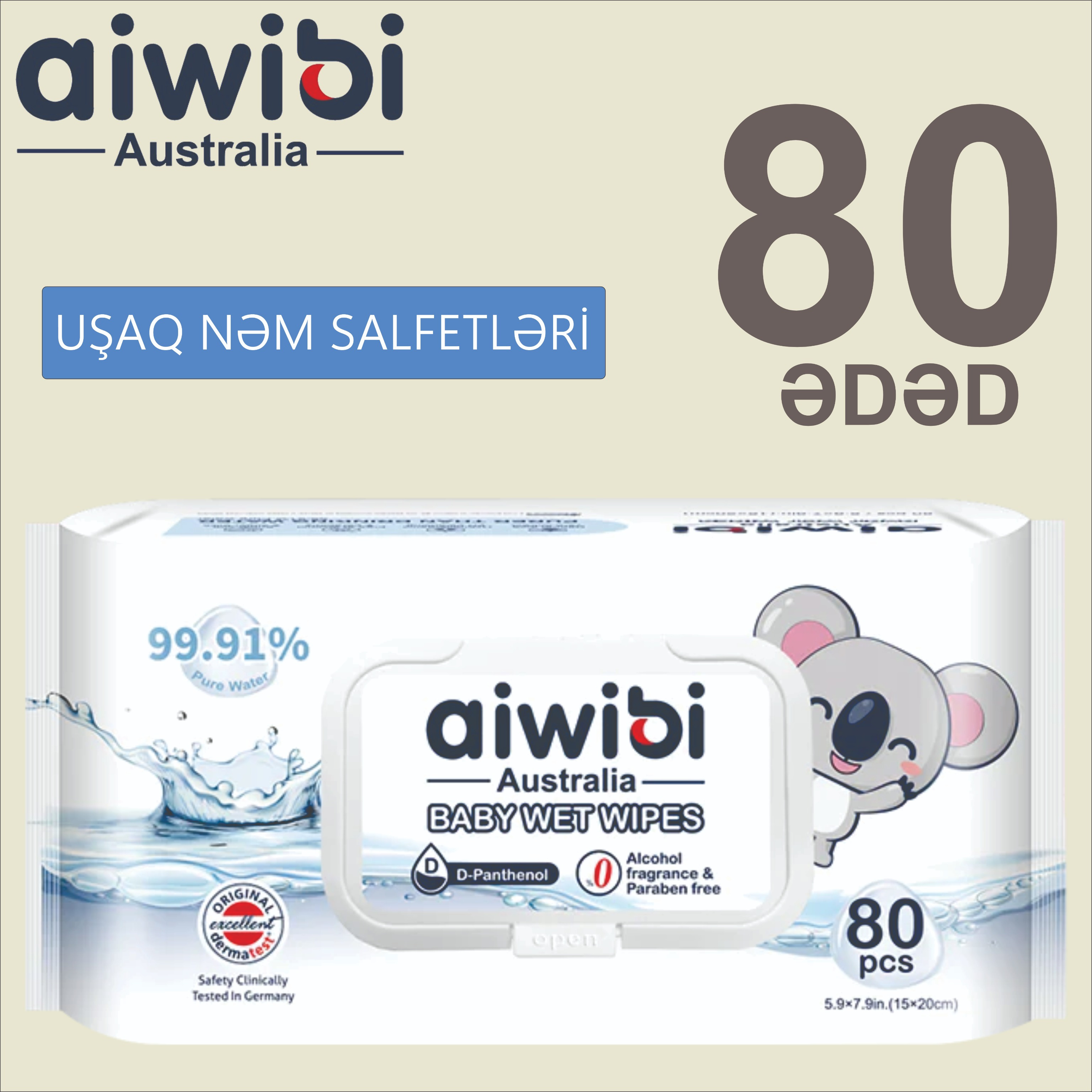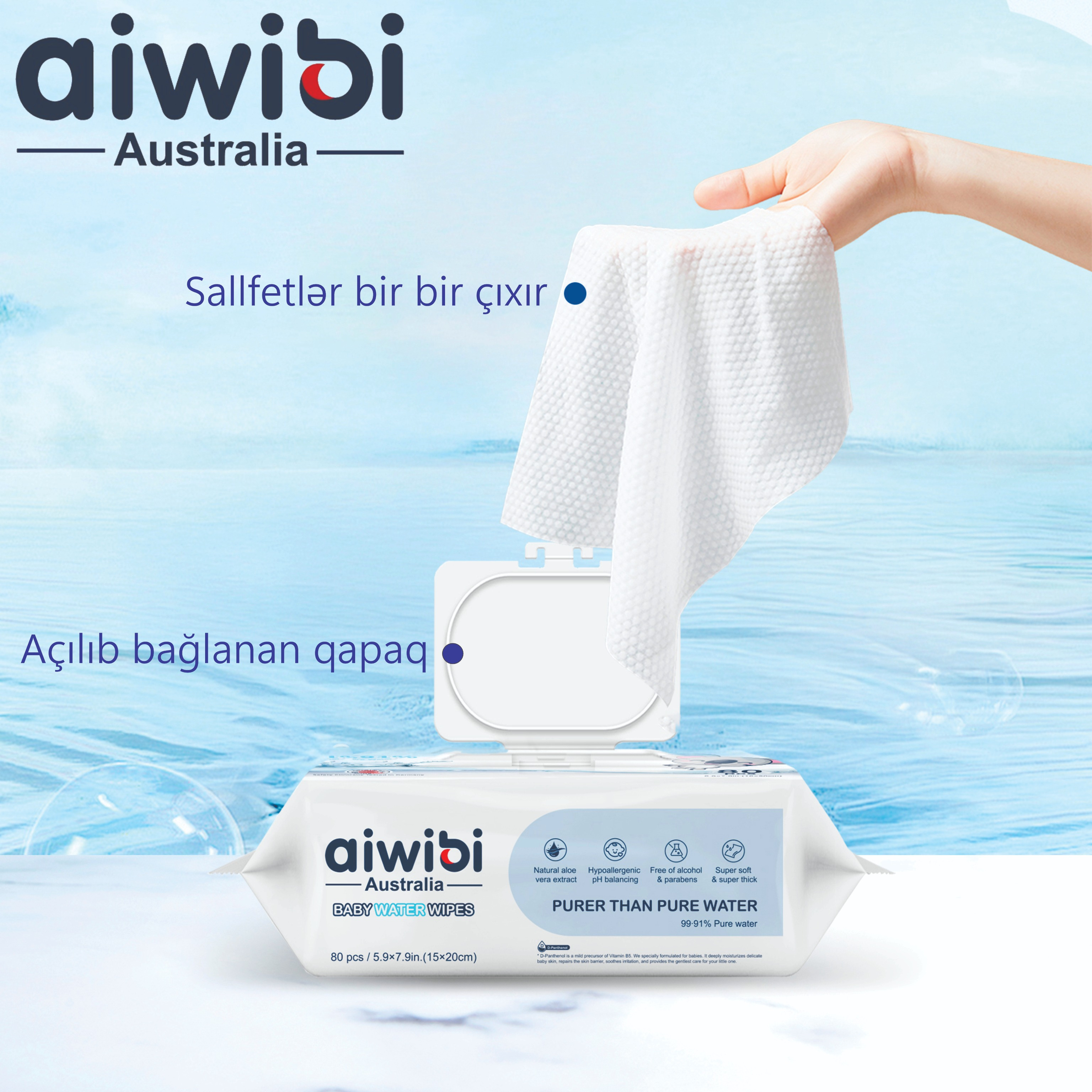Aiwibi Australia uşaq nəm salfetləri tərkibində çox saylı filtrasiya prosesi ilə təmizlənmiş 99,91% EDI təmiz su olan premium spunlace toxunmamış parçadan hazırlanmışdır. Bu salfetlər körpənin zərif dərisi üçün saf və təbii təmizləmə təklif edir. Aloe vera ekstraktı və D-Panthenol ilə zənginləşdirilmiş zərif nəmləndirici və sakitləşdirici baxım təmin edir. Hipoallerqik və spirtsiz bu salfetlər suyun özü kimi saf və yumşaqdır və körpənizin dərisini təmiz və təravətli edir.
