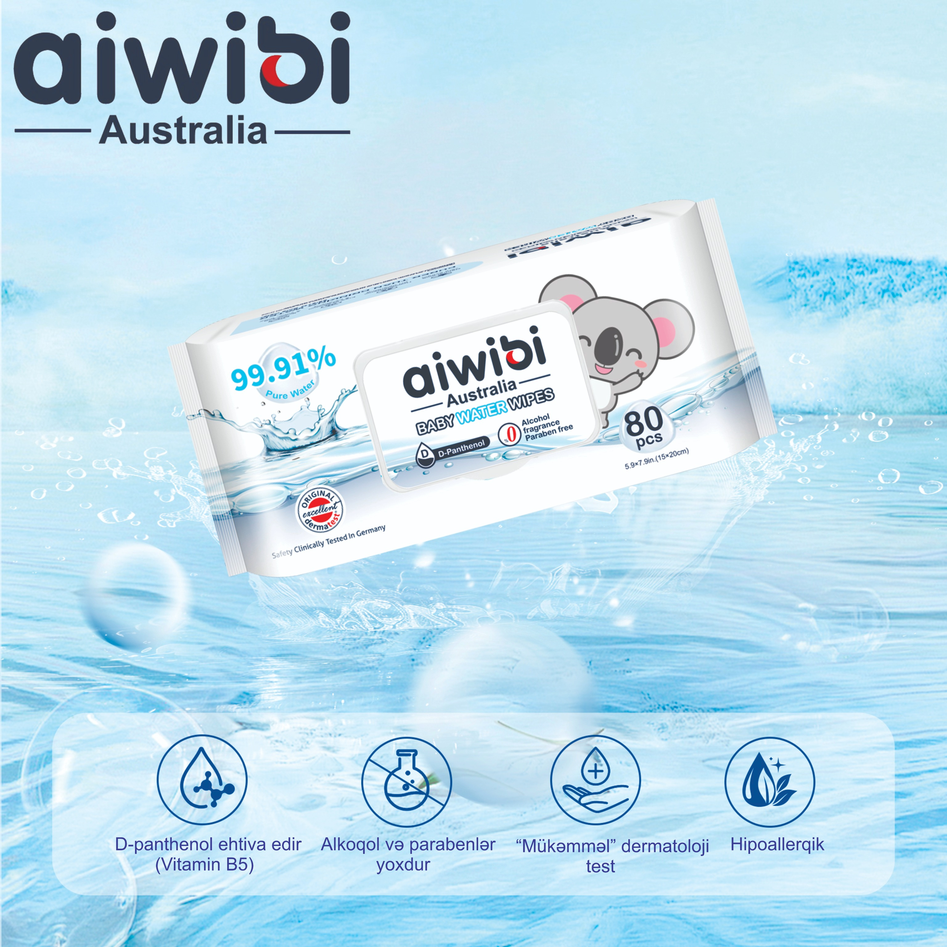 Aiwibi Australia uşaq nəm salfetləri tərkibində çox saylı filtrasiya prosesi ilə təmizlənmiş 99,91% EDI təmiz su olan premium spunlace toxunmamış parçadan hazırlanmışdır. Bu salfetlər körpənin zərif dərisi üçün saf və təbii təmizləmə təklif edir. Aloe vera ekstraktı və D-Panthenol ilə zənginləşdirilmiş zərif nəmləndirici və sakitləşdirici baxım təmin edir. Hipoallerqik və spirtsiz bu salfetlər suyun özü kimi saf və yumşaqdır və körpənizin dərisini təmiz və təravətli edir.